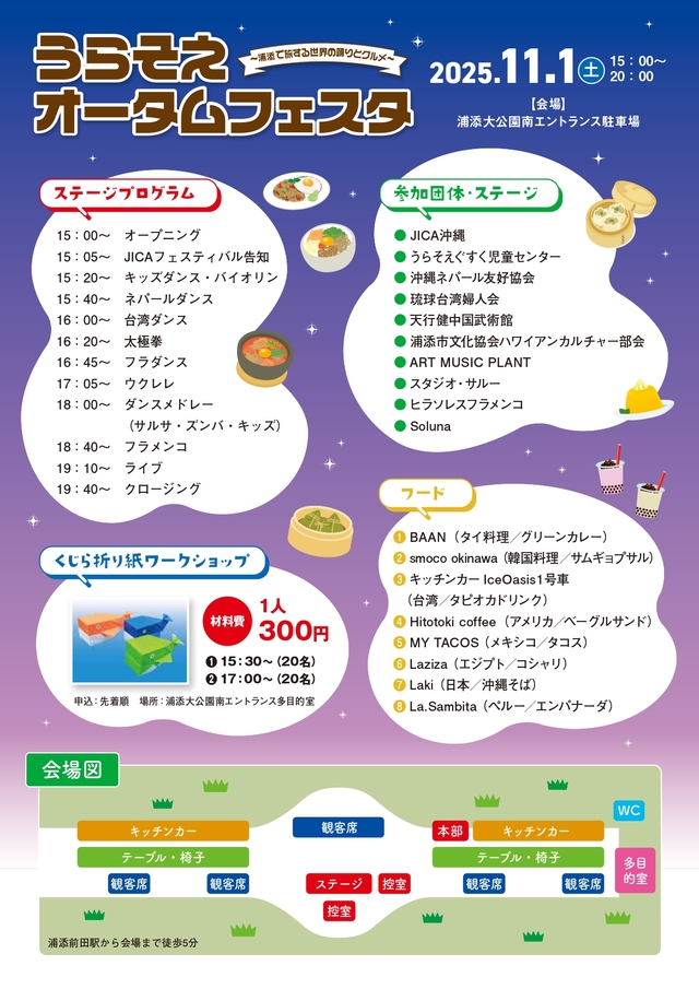 11月1日(土)に浦添大公園南エントランス駐車場にて「うらそえオータムフェスタ~浦添で旅する世界の踊りとグルメ~」を開催いたします!