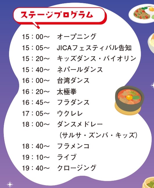 会場を盛り上げてくれるステージプログラムは、フラダンスやフラメンコ、太極拳からキッズダンス。