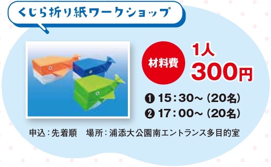 お子様から大人まで楽しめる「くじら折り紙ワークショップ」を実施。こちらは当日受付ですので、参加ご希望の方は当日南エントランス多目的室までお越しください。