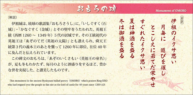 この碑文のおもろは、「ゑぞのいくさもい(英祖王の童名)」が、夏も冬もわかたず、毎月のように酒盛りをするほど、豊かな世を実現した、と賛美したものです。
