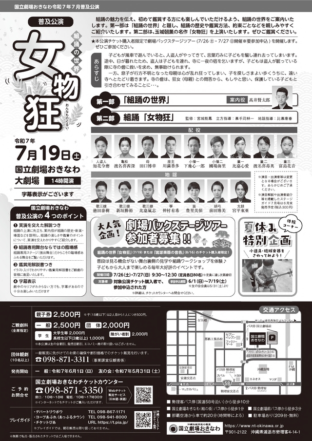 | 問合せ | 国立劇場おきなわチケットセンター 098-871-3350 窓口:10時~18時 電話:10時~17時30分 |