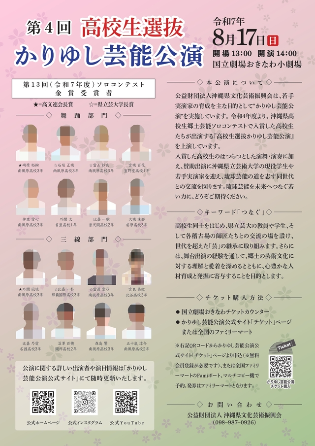 公益財団法人沖縄県文化芸術振興会は、若手実演家の育成を主な目的として"かりゆし芸能公演"を実施しています。 令和4年度より、 沖縄県高校生郷土芸能ソロコンテストで入賞した高校生たちが出演する『高校生選抜かりゆし芸能公演』を上演しています。