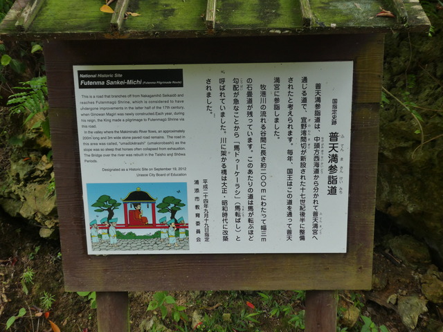 しばらくすると3番目の橋が見えてきました。当山橋と普天間街道 当山の石畳道です。琉球王国時代の首里城と沖縄本島を結ぶ街道が石畳の道として残っています。 この道は「普天間街道」の一部で、琉球王国時代の古くから信仰されている「普天満宮(ふてんまぐう)」の参道として賑わいました。 修復保存されている部分は全長約200mで、川に架かった「当山橋」や「馬転ばし」と呼ばれるほどの急坂が続き、交通の難所として知られていました。 そのたたずまいは、いにしえの香りが漂い旅情を誘います。